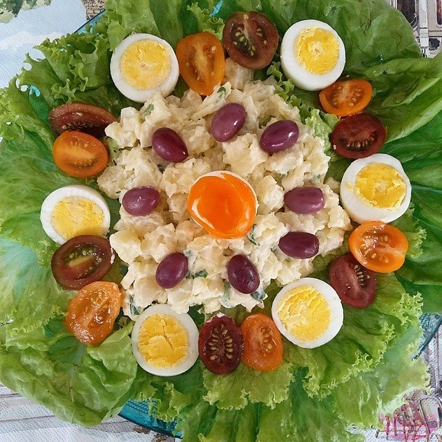 - folhas, salada de batata (tipo maionese), ovo cozido, tomate laranja, tomate verde e azeitonas.