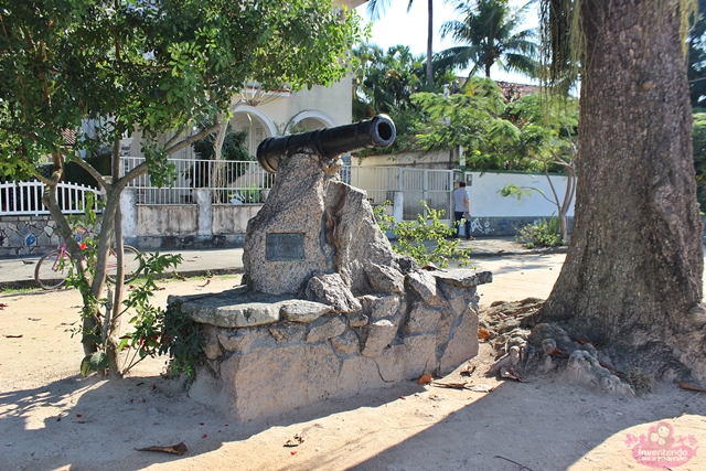 Este canhão em cima de uma pedra, no meio da rua, apontado para o horizonte da Praia dos Tamoios, fazia parte de uma bateria de canhões usada para saudar a chegada de D. João VI a partir de 1808, quando o rei começou a frequentar a ilha.