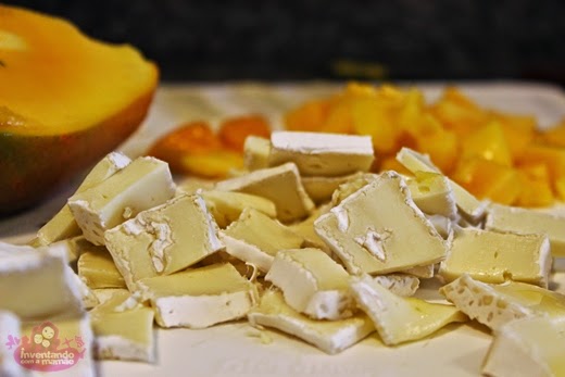 Cortamos a manga e o queijo brie em cubinhos. Reservamos.